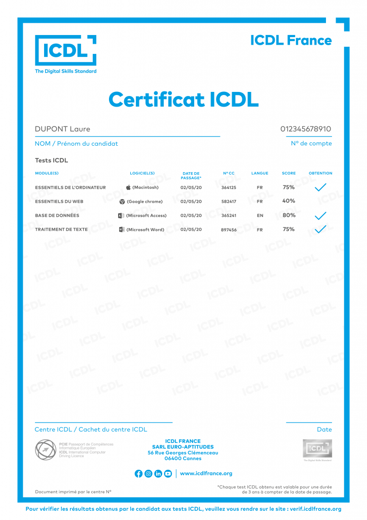 Il est composé d′un ensemble de modules de test aboutissant à une certification dans des domaines considérés comme fondamentaux dans l′utilisation quotidienne du poste de travail informatique.